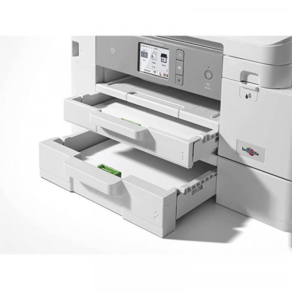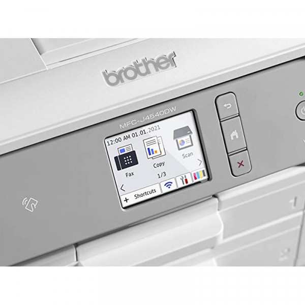 Imprimante Multifonction Jet d'encre Brother J4540DW - Fonctions : 4en1 (Impression, Copie et numérisation, Fax) - Format Papier : A4 - Technologie d'impression : Jet d'encre - Vitesses d'impression : 13 ipm en noir , 10.5 ipm en couleur - Résolution d'impression : (couleur) Jusqu’à 1 200 x 600 dpi ,(monochrome) Jusqu’à 1 200 x 1200 dpi - Interface : USB Hi-Speed 2.0 , 802.11b/g/n, NFC - Connectivité : Réseau Ethernet, Wifi - Mémoire 128 Mo - Écran : couleur tactile de 6.8 cm - Impression recto/verso - Dimensions : L x L x H : 33.5 x 43.5 x 25 Cm - Poids : 10.4 Kg - Couleur : Gris Clair - Garantie : 2 an